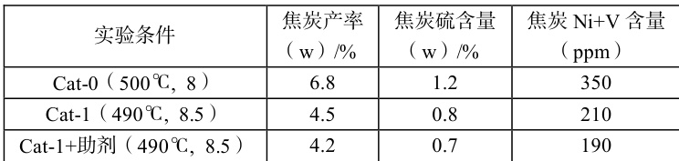 基准条件(Cat-0,温度 500∘C ,剂油比 8)下,焦炭产率为 6.8% (w),其中硫含量 1.2% (w), Ni+V 含量 350ppm (w)。优化后(Cat-1,温度490°C ,剂油比 8.5),焦炭产率降至 4.5% (w),降幅 34% 。