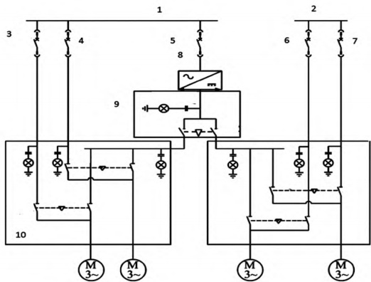 在上图中,1、2 分别为Ⅰ段母线与Ⅱ段母线,两段母线均为 6kV;3~7 为主通风机的风量调节开关;8 为变频器;9、10 为切换柜。