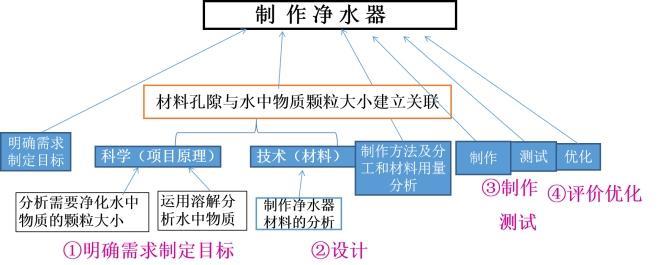 中年级学生使用的《制作简易净水器》案例在实施中进一步得到完善。第一课时创设情境明确需求,以科学技术原理为基础确定方案。包括对净化原理的认识、制作材料的分析及它们之间的关系。在此基础上展开第二课时—设计。包括合理绘制草图并能说明理由,小组间通过对比能互相提出修改建议等。基于设计图第三课时展开制作并完成测试。第四课时基于测试结果进行评测及进一步优化。经过几次研讨、试讲后优化后的实施流程。在实践过程中,探索的基于项目式学习的教学模式是这样的:(图一、图二)