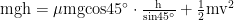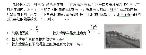 2mgh = μmgcos45° ∙ h sin45° − μmgcos37° ∙sinh37°,解得μ = 67,A 选项正确;滑草车在上下两段滑道上分别做加速运动和减速运动,它在上段的底部会达到最大速度v,由能量守恒得: