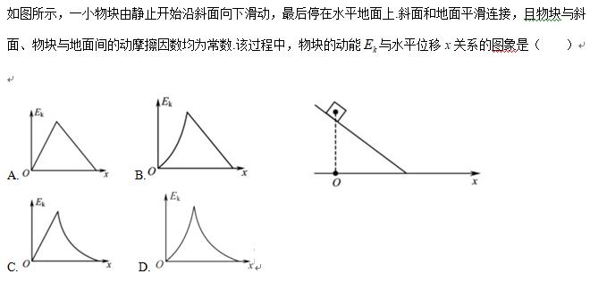 本题可以通过写出Ek和水平位移 x 之间的函数关系式和排除法来选出正确答案。相比较而言,物体在水平方向上的运动比较简单,根据动能定理: -μmgx=0-Ek ,得到物体在水平面上的动能与水平位移的关系: