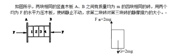 本题要求2、3 块砖之间的静摩擦力,肯定要把2 和3 这两块砖隔离开来,但在这之前,由于四块转都静止,可以把四块转看成一个整体,先用整体法,可以求出 A、B 两块板对整体的静摩擦力的大小和方向。由平衡条件 4mg=2f♯ ,