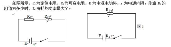 本题可以直接算功率,但过程较为复杂。当电源的内电阻不变时,电源的输出功率随外电阻的变化,存在着一个最大值,我们也曾建立过这样的简单模型,也就是当外电阻和内电阻相等时,电源有最大的输出功率。本题要计算的是 R2 的最大电功率,但 R2 不是全部外电阻,所以不能生搬硬套上面的结论。我们可以把电源和R1看成一个全新的等效电源,R2就变成了这个等效的新电源的外电阻,这时这个新电源的内阻为 R1+r 如图 1所示。此时再用上述的结论,问题就迎刃而解了。