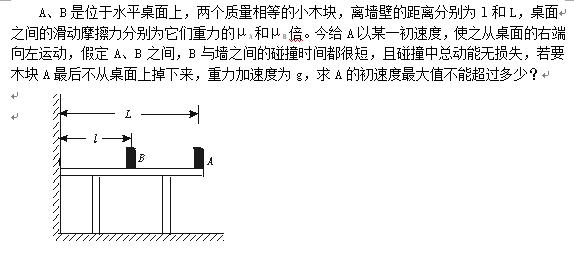 本题可分成两个过程计算,但过程复杂,计算量很大,用时很长。不过因为 A、B 碰撞、B 与墙碰撞都是弹性碰撞,且 A、B 质量相等,所以当 A 与 B 碰撞时,会交换速度,B 与墙碰撞时,会原速反弹。本题可以把对象和过程简化成一个物体的运动,且在不同部分的动摩擦因数不同。可以设v0为 A 的最大初速度,回到桌边速度恰为0。根据动能定理: