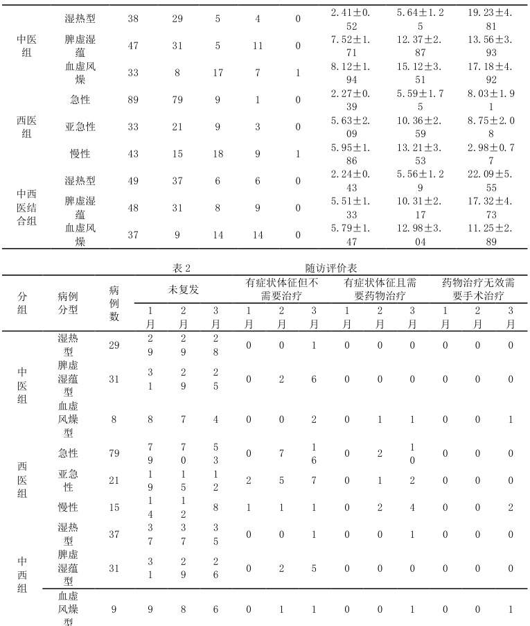 中医组脾虚湿蕴型 47 例、血虚风燥型33 例、湿热(浸淫/下注)型38 例;西医组急性期89 例、亚急性期 33例、慢性期 43 例;中西结合组脾虚湿蕴型48 例、血虚风燥型37 例、湿热(浸淫/下注)型 49 例。因其他证型患者数量过少,未纳入统计分析。经统计分析,各组患者的年龄、病程、男女比例与流行病学一致[5-6]无明显统计学差异,具有可比性。