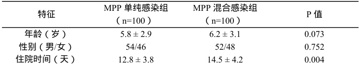 表 1 展示了两组患儿的基本特征,包括年龄、性别、住院时间等。MPP 混合感染组患儿的平均年龄为 6.2 岁( SD=3.1 ),略高于 MPP 单纯感染组的 5.8 岁( $S _ { Ḋ } \mathrm { D } { = } 2 . 9 \lambda _ { \mathrm { Ḋ } }$ 。两组在性别分布上没有显著差异( p>0.05 ),住院时间方面,混合感染组患儿的平均住院时间为 14.5 天t ⋅SD=4.2) ,显著高于单纯感染组的12.8 天 (SD=3.8)(p<0.05)b