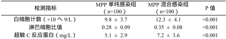 在实验室检测结果方面,MPP 混合感染组的白细胞计数( 12.3±4.1 vs. 9.8±3.7 ,