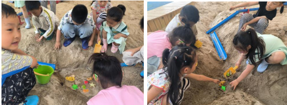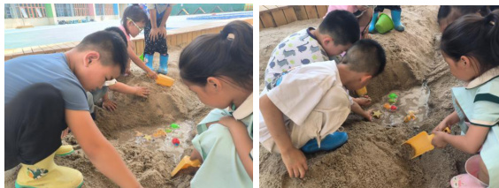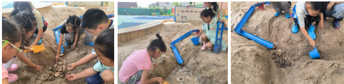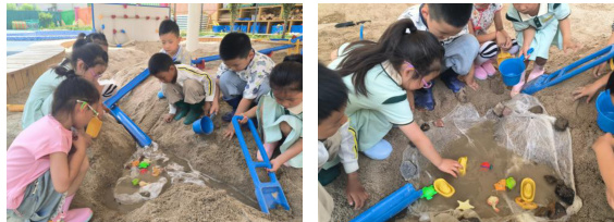 沙水区中有粗沙、细沙、水池等不同区域,孩子们通过实地考察,最终选择了在粗沙区中制作“海洋池”,这里靠近水源,为后期的注水和维护提供了便捷。