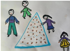 “公园的小路上铺满了鹅卵石,我们可以把石头铺在下面。”沐沐:“这样乱七八糟地放可不行,我们要将石头铺满池子的底部,这样才能留住水。”为此,幼儿决定先画好设计图再进行“施工”。