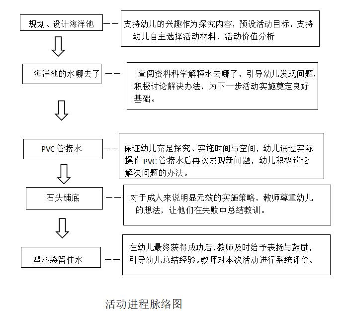 幼儿是发展中的人。面对沙池注入的水不断渗入沙中,无法完成海洋池的建造问题,孩子们想到借用 PVC管不断往海洋池中注水这一策略解决海洋池的水很快消失这一难题,但是面对新的问题,孩子们继续绞尽脑汁的商讨解决办法。