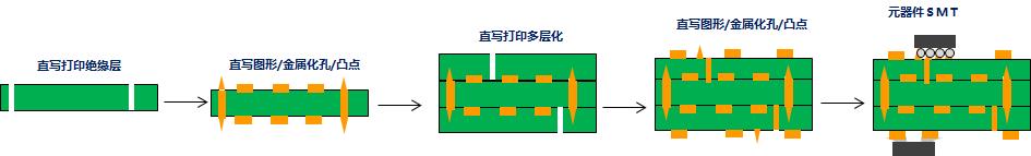 基于 2D 喷墨直写打印的 PCB 加成工艺流程如下图 3 所示,制作多层 PCB 之后,仍需要进行基于 XY 平面的表面安装技术(SMT),通过焊料或导电胶完成元器件与 PCB 间的电气和结构互联。与传统制造工艺相比,2D 喷墨直写打印具有五个优点[15]:(1)不依赖基底材料的性质,印刷可以在任何材料表面沉积功能材料。(2)印刷可以大面积与批量化制造,除传统平面丝网印刷外,高速连续卷对卷方式可以制作大幅面柔性电子产品。(3)制造成本低,约为传统加工方式的20~40%。(4)绿色环保,减少了原材料浪费,减少了因腐蚀而形成的污染排放,节省了能源,减少了碳排放。(5)数字化与个性化的快速制造。不需要模板,可以快速制造小批量个性化电子产品,所消耗的工时是传统制造方式的30~50%。