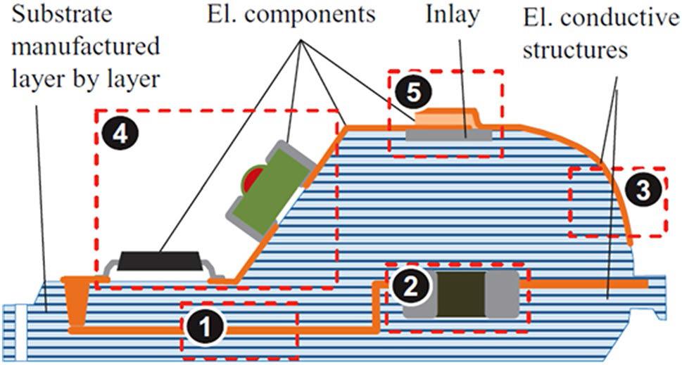 (5)高可靠性保障具有防尘防水等功能避免了内部(5)高可靠性保障,具有防尘、防水等功能,避免了内部电子元器件受到污染,也为元器件的抗冲击振动提供有力保护。(6)元器件的任意位置安装使互联电路最短、体积更小、重量更轻,因此在体积、性能和灵活性方面有其独特的优势。典型的功能性结构电子如下图4 所示[18],为异形、多层、多嵌入、多重印刷的综合性电子组件,它打破了传统平面硬质 PCB 组件的结构和电气互联形式,为更高集成度的电子组件提供一种新型设计和制造解决方案。