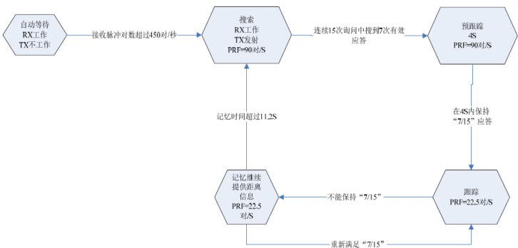 DME 设备状态转换流程为:机载询问器在空中处于自动等待状态,期间只接收来自地面DME 台站的信号并计算脉冲对数,当接收到的脉冲对数超过450 对/秒时转为搜索状态,航班搜索对自己询问信号的应答,满足7/15次应答后转为预跟踪状态,期间给出距离信息,持续时间4 秒后转为跟踪,正常进行距离的持续计算和输出。具体流程如图所示: