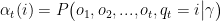 式(4)中, αt(i) 为 O 中的观察序列在 σt 时段内处于状态 i 的概率; P 为概率值;ΔO1 、 O2 、…、 ΩOt 为 O 中的观察序列; qt 为隐藏状态。通过递推公式,构造并网负荷预测约束隐藏序列,公式如下: