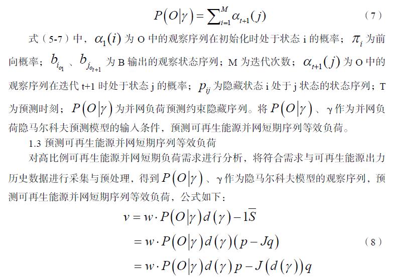 本文设计的高比例可再生能源并网条件下隐马尔科夫短期负荷预测方法,将历史负荷数据、可再生能源发电数据、气象数据集成到数据集中,根据隐马尔科夫模型确定隐藏状态、运行状态概率向量,构造相应的预测约束。结合约束条件构造隐藏序列,反映并网过程汇总的不确定性。根据隐藏状态序列,预测未来隐藏状态的概率矩阵,生成短期时段的可观测状态预测值(即等效负荷预测值),有效提升了并网短期负荷预测精度,为并网稳定调整提供数据支撑。