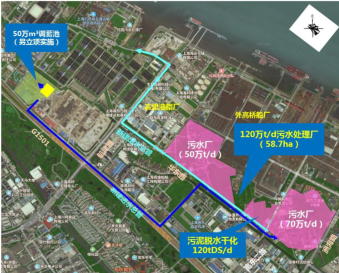 上海竹园污水处理厂四期工程 3.1 标选址于浦东新区高东镇,项目用地范围南至华东路、东至洲海路、西至规划高东新路、北至外高桥船厂,总用地面积 58.7 公顷。工程采用分区建设模式:西部地块规划建设 50 万 m3/d 污水处理设施,东部地块建设70 万 m3/d 污水处理设施,中间地块为 120tDS/d 污泥处理区,整体污水处理规模达 120万 m3/d (如图 1 所示)。项目设计出水水质执行《城镇污水处理厂污染物排放标准》(GB18918-2002)一级 A 标准,处理后的污水通过压力管道输送至现状合流一期高位井后排入长江,管道高峰设计流量按相应标准设定。污泥处理方面,经处理后含水率降至 30% 以下,外运至外高桥电厂进行掺烧处置,实现污泥资源化利用。