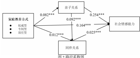 通过路径分析模型检验家庭教养方式对乡村中小学生社会情感能力的影响机制,重点关注亲子关系与同伴关系的中介效应。图 2 报告了家庭教养方式对农村地区中小学生社会情感能力的路径分析模型。