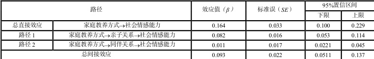 第二,亲子关系与同伴关系在家庭教养方式与乡村中小学生社会情感能力间发挥中介作用。亲子关系的中介效应(β=0.082)占总间接效应的 88.2%,表明家庭教育方式对学生社会情感能力的发展大部分通过亲子关系的中介效应;同伴关系的中介效应(β=0.011)显著但微弱。具体而言,良好的亲子关系为孩子提供一个安全、支持和关爱的情感基础,是社会情感能力发展的前提。