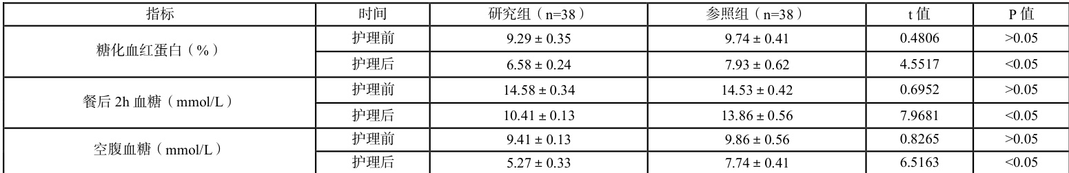 自2024 年 8 月起,开始收集诊治糖尿病的老年病例资料,至2025 年 8 月止共纳入 76 例,通过随机抽号法进行分组。研究组 38 例中,男性19 例,女性19 例。年龄值域 60-88 岁,年龄均值( 74.21±0.22 )岁。参照组38例中,男性 21 例,女性17 例。年龄值域 60-87 岁,年龄均值( 74.58±0.34 )岁。对比两组一般资料( P>0.05 ),可比性较强。