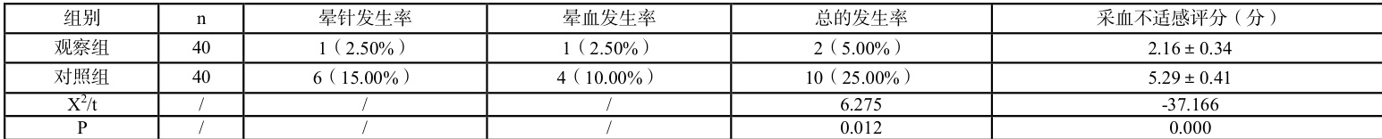 两组干预效果比较,见下表 1,两组晕针、晕血发生率总的发生率和采血不适感评分差异显著,组间有统计学意义( P<0.05 )。