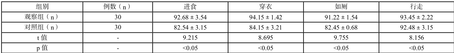 本次研究结果显示,观察组患者在日常生活能力评分方面成绩更优秀,证明了该护理干预方式的有效性,能够帮助患者改善生活,差异具有统计学意义,( P<0.05 )。