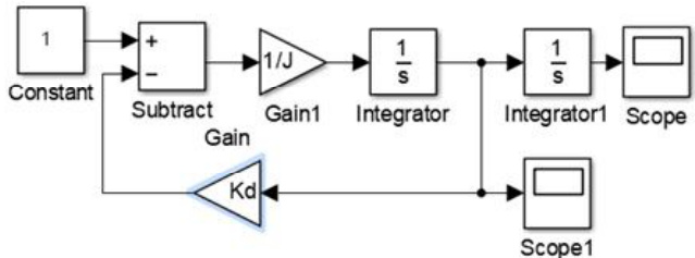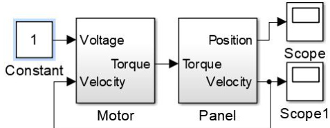 将太阳能电池板旋转部分的数学模型(1)整理后,在 Matlab 仿真软件的Simulink 模块中建立仿真模型[9]如图 1 所示: