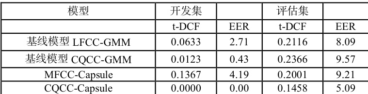 表 2 展示了所提模型在评估集上的性能:MFCC-Capsule 模型的 t-DCF为 0.2001,EER 为 9.21,在评估集(含已知和未知攻击)上略优于基线算法;CQCC-Capsule 模型在开发集(仅已知攻击)上取得了 t-DCF 和 EER均为 0 的最优性能,表 1 不同模型在逻辑访问场景下开发集与评估集的t-DCF 和 EER 得分