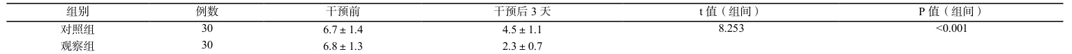 干预前两组 VAS 评分无差异( P>0.05 );干预后观察组显著低于对照组( P<0.05 ),且不同病种均有改善(表 1)。