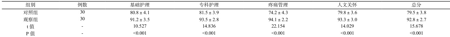 观察组各维度评分及总分均高于对照组(P<0.05),尤其专科护理(病种适配干预)和疼痛管理维度优势明显(表2)。