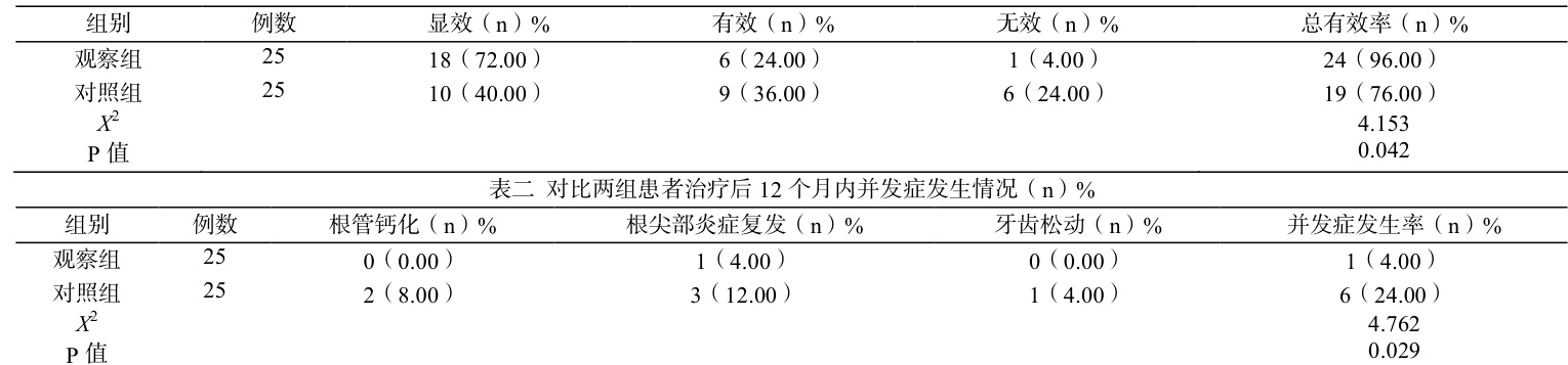 以年轻恒牙来看,发现其髓腔往往较大,还存在牙体组织较薄的状况,很容易产生牙龈感染的问题,会加大根尖周病变状况发生,进而影响患者的咀嚼功能,会对患者日常生活带来困扰。因此,应对该病变状况予有效的治疗。现阶段,在临床工作中对血运重建术、以及根尖诱导成形术这两种治疗方式的运用率较高,但在实施根尖诱导成形术治疗时,发现其主要在于使用氢氧化钙诱导剂,对根尖孔予以尽快的封闭,该治疗方式虽然具备操作便利等相关的优势,但总体治疗时间较久,易于产生根管钙化等相关的并发症,而在进行血运重建术治疗时,则能将根管存在的感染组织加以尽快的清除,可诱导血管重建。并且还强调发挥生物陶瓷 BP 封闭剂的作用,对根管予以充分的封闭,有助于促进根尖孔的尽快闭合。更为主要的是,以生物陶瓷来看,不管是在封闭性能、还是在生物活性等方面上均具有极大优势,如此在推动牙龈组织的有效再生上,也助于打造出更为适合的微环境,可提高其再生效果[3]。在此次研究中,对照组实施根尖诱导成形术(氢氧化钙诱导)治疗,观察组进行血运重建术(生物陶瓷 BP 封闭)治疗。在展开上述治疗工作后,发现观察组的临床疗效要高于对照组,并发症发生率要低于对照组,即说明在年轻恒牙根尖周病变修复的过程中,相较于根尖诱导成形术,血运重建术的应用价值更高。