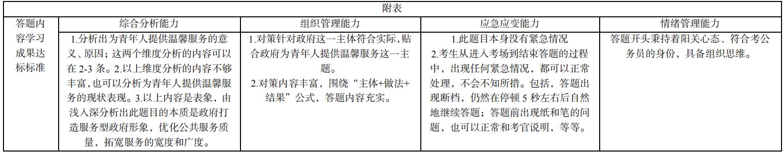 比如以一道真题为例,2024年黑龙江省公务员县乡面试题(考生回忆版)第1题:“某地政府打算在广场周边为年轻群体开设快递、外卖驿站,以此为青年人提供温馨服务。对此,你怎么看?”学员可以在练习这道题过程中,对照摸底测试表的评测标准,即可得出自己的学习成果是否达标。其中,外在表现学习成果达标标准直接参考摸底测试表即可;因为每道题的问法不同,答题内容考查的侧重点也会不同。本文主要以“怎么看”为例。具体操作如附表。