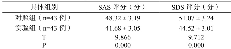 老年脑梗死患者关于 SAS 评分、SDS 评分对比,实验组低, P<0.05, 。详见表 1。