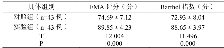 和对照组老年脑梗死患者相比,实验组 FMA 评分、Barthel 指数更高,P<0.05 。详见表 2。