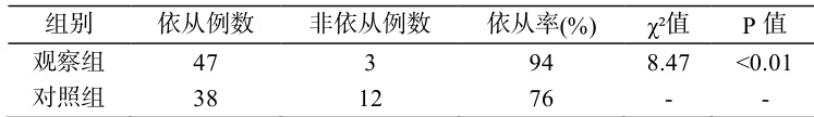 观察组依从率 94%vs 对照组 76% ( P<0.01 )。