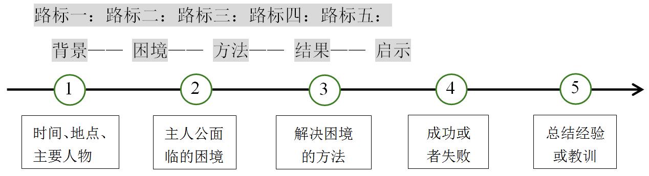 在路标图示中,一共分为五个路标,路标一“背景”,介绍故事发生的时间、地点、主要人物;路标二“困境”,交代主人公面临的困境;路标三“方法”,体现解决危机所采取的一系列行动;路标四“结果”,呈现困境解决结果;路标五“启示”,即困境解决结果对人物的影响。这样的路标为“困境—解决”结构类文章提供方便使用的思维工具,具有直观、形象、可视化的特点,既呈现了事件发展的顺序,也呈现了事件的逻辑。清晰地展现了事件的动态发展过程以及人物在这一过程中的心路历程,将隐含的故事结构可视化、可操作化,易于学生掌握。