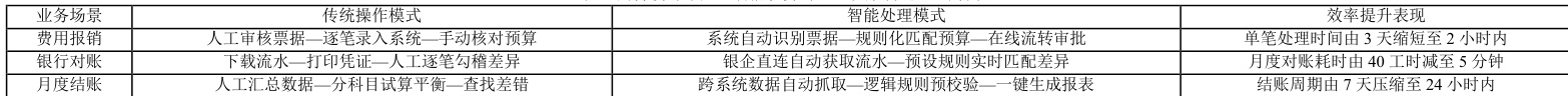 人工智能技术借助流程自动化重构传统财务作业模式,有效压缩人工操作耗时,这使财务人员从重复性手工任务中解放出来,可以将更多的时间、精力放在增值分析相关活动。人工智能提高会计工作效率的三大典型场景见表1。