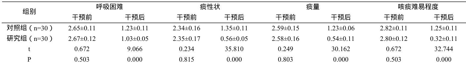 分析两组患者干预前后临床症状评分,主要从呼吸困难、痰性状、痰量以及咳痰难易程度等,0-3 分,分数高说明患者症状比较严重。
