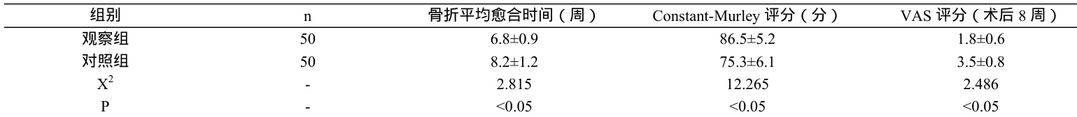 观察组骨折平均愈合时间较对照组缩短1.4 周( P<0.05 );术后3 个月,观察组 Constant-Murley 评分显著高于对照组( P<0.05 ),表明肩关节功能恢复更好;术后 8 周,观察组 VAS 评分明显低于对照组( P<0.05 ),疼痛缓解效果更优。见表 1 。观察组肩关节僵硬等并发症发生率为 10% ,低于对照组的 25‰ 。