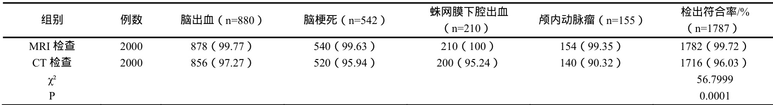 比较分析结果显示,MRI 检出符合率明显高于 CT 检查结果,数据对比结果显示具有统计学意义( P<0.05 ),具体结果详见表 1