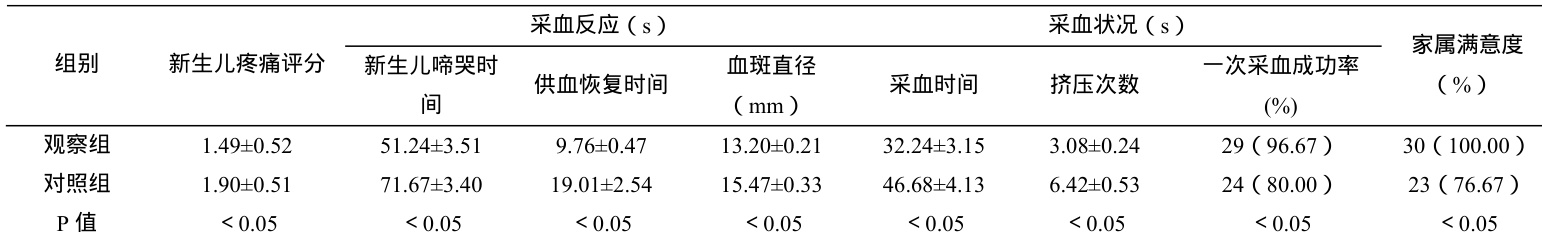 观察组实施无痛足底血采集技术及细节护理,步骤显示:1)建立小组,开展理论知识与专业技能的相关培训及考核,提高临床医疗人员专业技术及整体职业素养【2】。2)采用亲切温和语言方式向新生儿家属说明无痛足底血采集技术优势,讲解无痛采血流程、采血目的及作用,促进家属积极配合【3】;调整病房温度、湿度 ⋅23-26∘C 、 50%-55% ),播放轻柔、舒缓音乐,确保治疗环境舒适。3)采血前以环抱姿势喂养新生儿,保证产妇与新生儿皮肤接触,创造安全感;采血时利用酒精对足部进行消毒,将掌心贴紧新生儿腓肠肌,从腘窝向踝关节处按摩,放松足踝,促进血液循环;精准进针控制穿刺时间和疼痛感,进针深度控制在 1.3-2.0mm ,停顿 10-15s 后观察出血状况,待血液自然滴出至豆粒大小时采集【4】;利用无菌棉球按压穿刺点 3-5 分钟,避免揉搓;密切观察新生儿足部情况,采取有效保暖措施和个人卫生管理,避免发生感染症状。