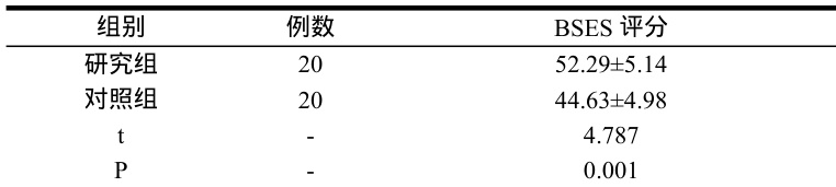 相较于对照组,研究组的 BSES 评分明显更高,差异具有统计学意义(