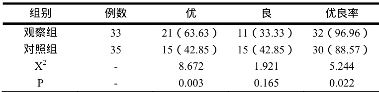 观察组整体症状改善优良率明显高于对照组, P<0.05 ,有统计学差异,见表 1 。