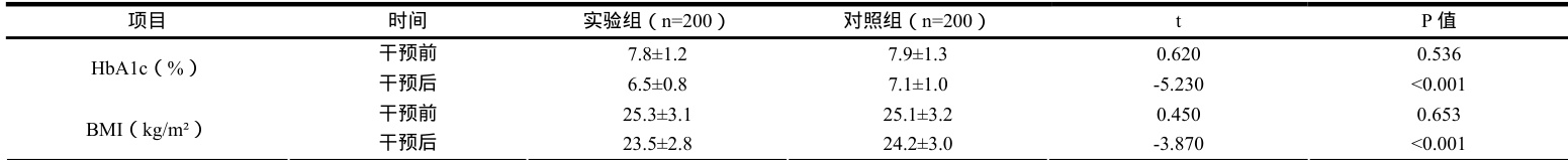 干预前两组 HbA1c、BMI 无差异( P>0.05 );干预后实验组 HbA1c、BMI 显著低于对照组( P<0.05 ),见表 1。