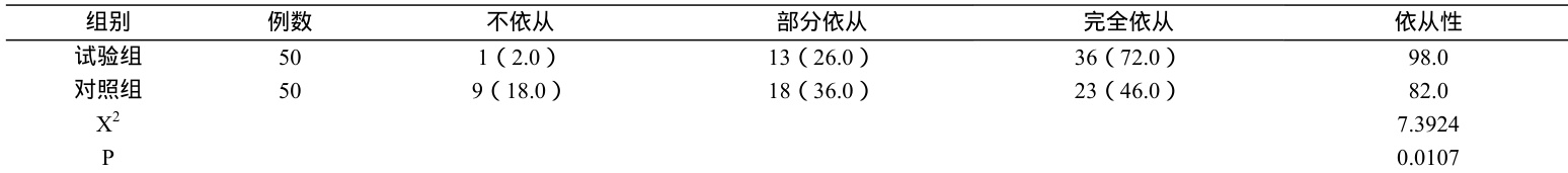 表1 内依从性的判定结果:试验组高于对照组( P<0.05 )。