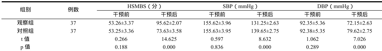 干预前两组 HSMBS 评分、SBP、DBP 差异小( P>0.05 ),干预后观察组HSMBS 评分高于对照组,而SBP、DBP 均低于对照组( P<0.05)