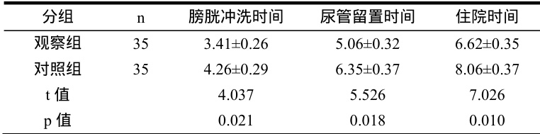 观察组术后下述时间均短于对照组, ① 膀胱冲洗时间、 ② 尿管留置时间、 ③ 住院时间( P<0.05)