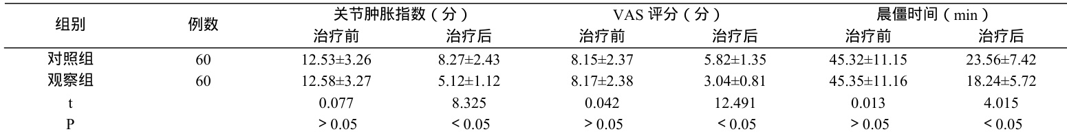 2.2 两组患者治疗前后关节肿胀指数、VAS 评分及晨僵时间比较