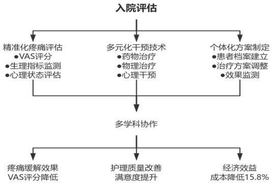 该研究通过构建精准化疼痛评估体系与整合多元化干预技术及制定个体化管理方案,成功建立了创新的疼痛管理模式。临床实践验证显示创新组 VAS 疼痛评分显著降低,镇痛药物用量减少 32.5% ,疼痛发作频次降低 45.7% ,护理质量方面疼痛评估准确率从 76.3% 提升至 94.2% ,护理满意度显著提高,不良事件发生率从 8.7% 降至 2.5% ,住院时间缩短 2.3 天。该创新模式不仅显著改善了疼痛控制效果与护理质量,还降低了总医疗成本 15.8% ,具有良好的临床推广价值。