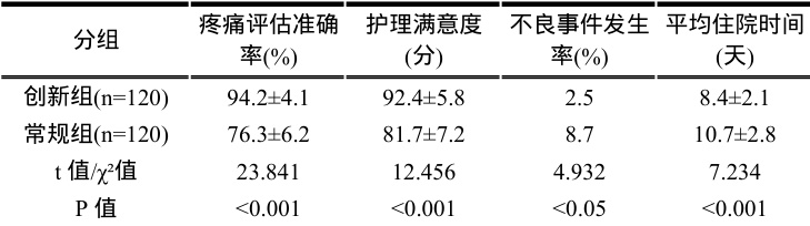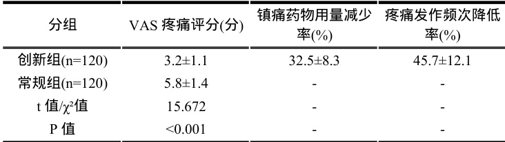 采用前瞻性随机对照研究,240 例患者分为创新组与常规组各120 例。统计分析采用SPSS 26.0,计量资料用均数 ⋅± 标准差表示,组间比较采用t 检验,计数资料采用χ²检验。结果显示创新组在疼痛缓解方面显著优于常规组( P<0.001⋅ ),具体数据见表1。