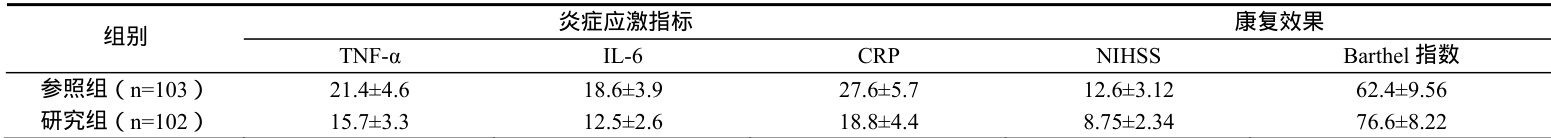 分析观察两组在术后并发症发生率、炎症应激指标(TNF- ⋅a, 、IL-6、CRP)水平、康复效果(神经功能缺损评分NIHSS、日常生活活动能力评分Barthel 指数)方面的差异表现。